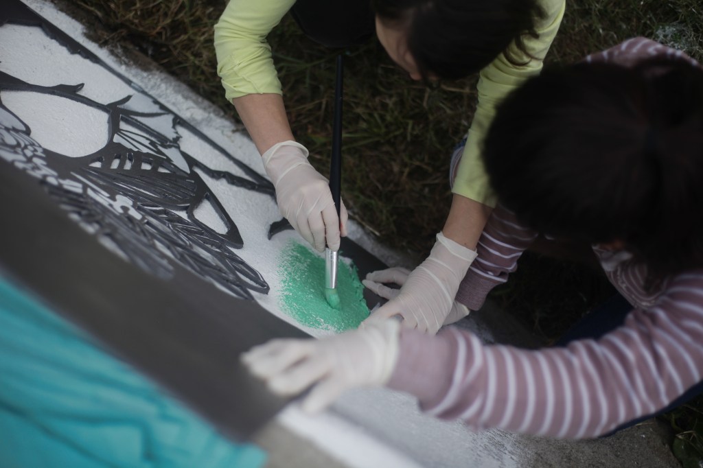 În acest an am ales să împărțim creativitatea și actul artistic cu întreaga comunitate din Hosman așa că, după obținerea aprobării Primăriei, am ieșit în stradă pentru a picta o porțiune din digul care ne întâmpină la intrarea în Hosman. Împreună cu copiii, profesorii au lucrat la crearea unui stencil, care mai apoi a fost folosit ca șablon pentru pictura de pe dig. Munca acestora a fost răsplătită prin bucuria cu care comunitatea a reacționat la vederea picturii. Mai jos puteți observa pas cu pas demararea acestui proiect, precum și rezultatul final.