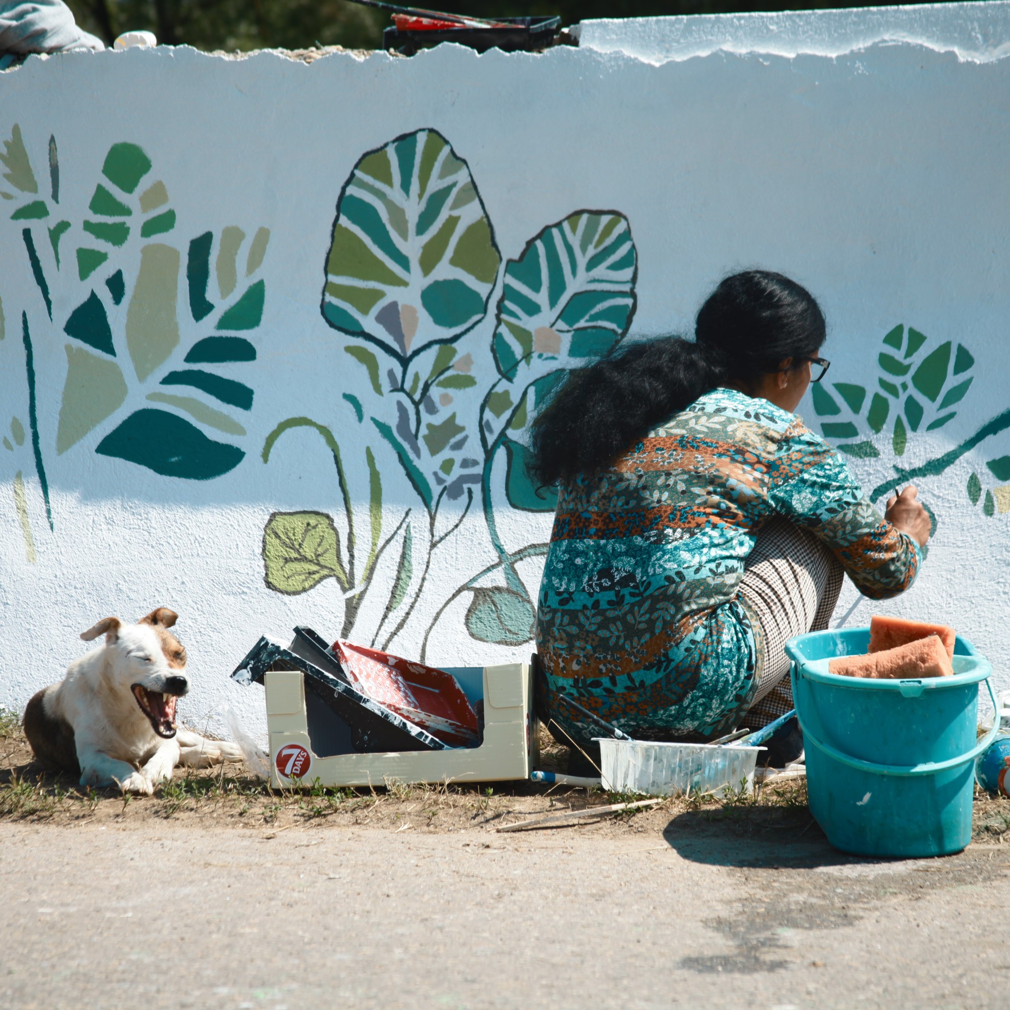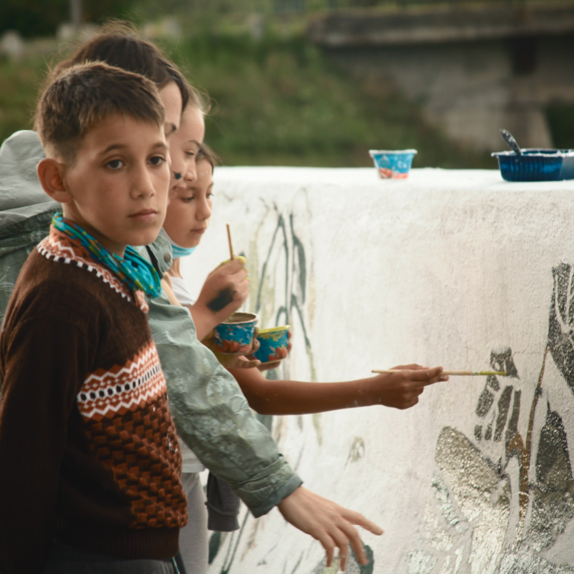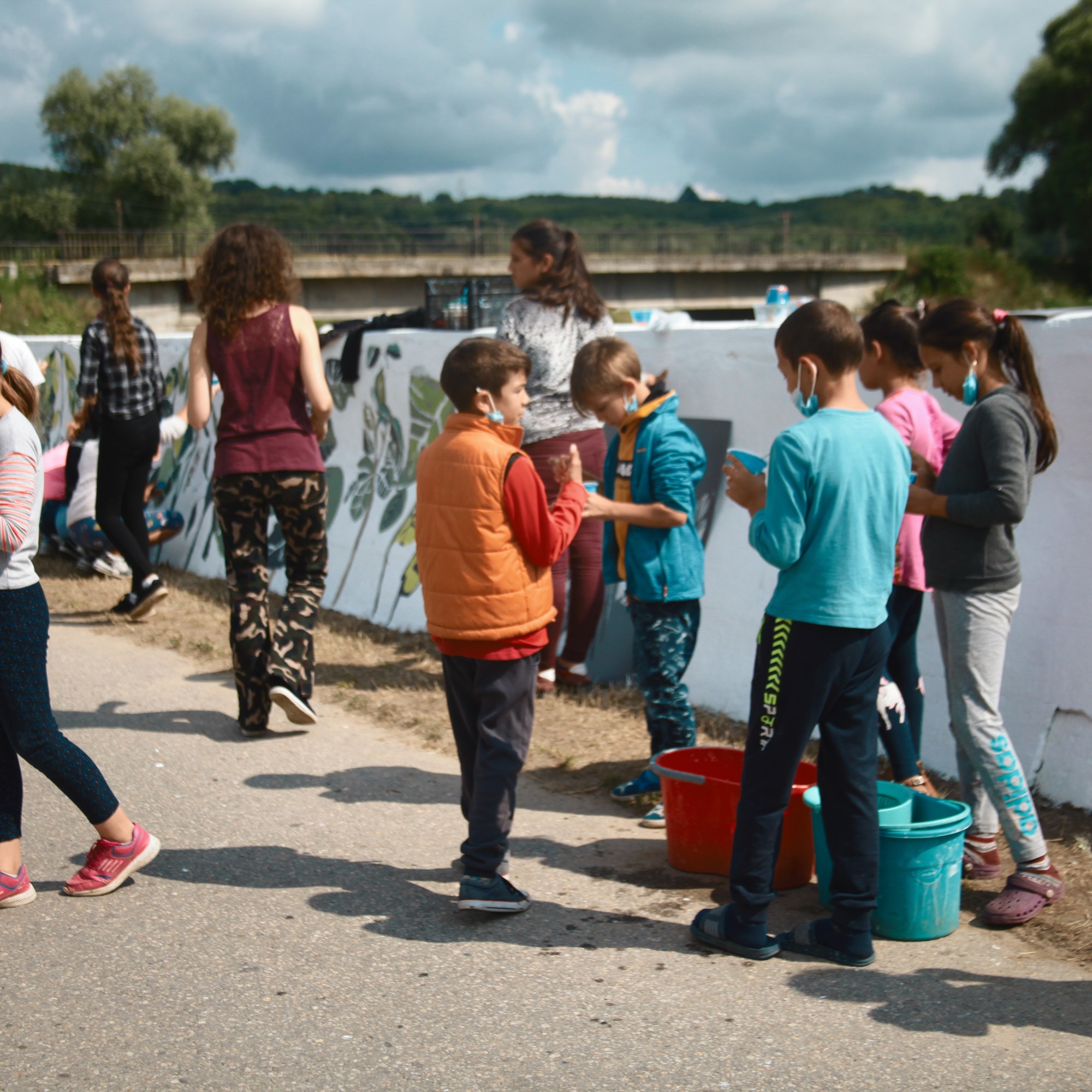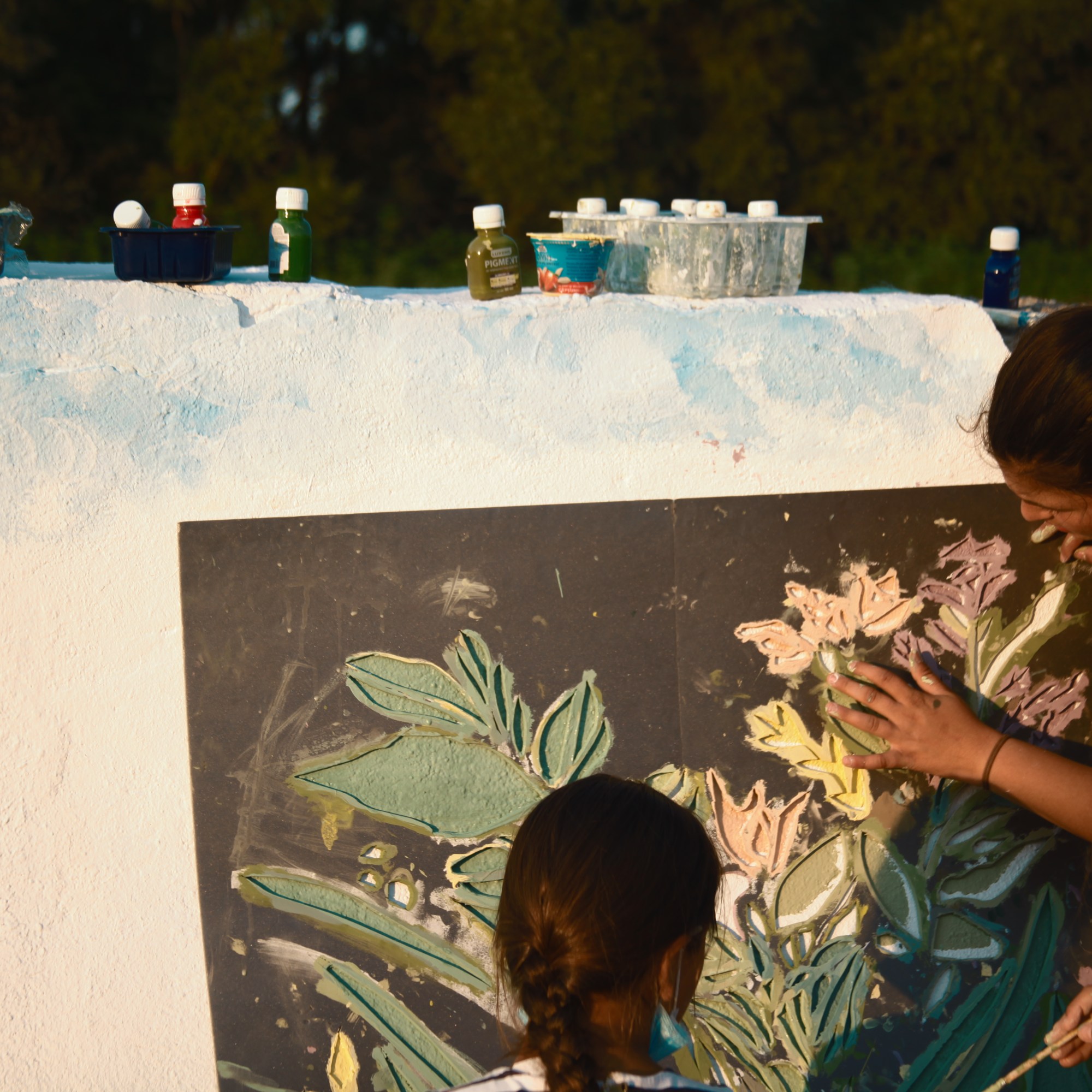 Anul acesta ne-am bucurat de implicarea unor părinți ai copiilor care au participat în mod activ la proiectul de artă pe parcursul diferitor etape, de la pregătirea locului de lucru, la primul strat de lavabilă albă, la ultimul detaliu adăugat pe frunzele create cu șablonul.